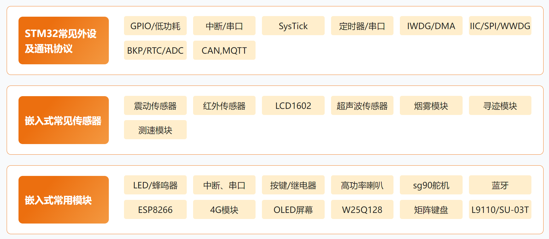 本课采用“项目驱动、实战为主”的教学理念,将核心知识点无缝融入实际项目过程,学员在做中学、学中练,扎实掌握嵌入式开发的关键技术。所做项目可直接用于求职简历、实习申请、毕业设计或竞赛展示。课程配备全程答疑与远程指导,并提供简历优化、就业辅导与offer选择咨询等一站式就业服务,帮助零基础学员高效入行,快速拿下高薪岗位。