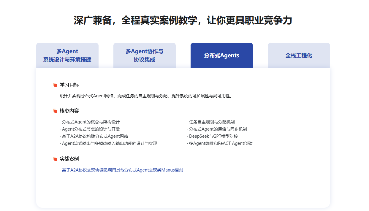 多/通用型Agent开发是热门、高薪就业方向,也是构建核心竞争力的优选。但多数课仅停留在工具调用和简单案例层面,难以满足企业对深度融合AI解决复杂问题的人才需求。本课直击这一痛点,带你从0到1,从单/多Agent、分布式架构,再到全栈工程化,助你从程序思维升级到系统思维。通过复刻类Manus核心模块,深入掌握MCP、A2A、COT、多模态,及任务规划、分布式调度等核心能力,成为企业急需AI多Agent全栈工程师。