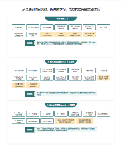 物联网/嵌入式软件工程师视频教程。本课程旨在为初学者提供一个全面的嵌入式软件开发学习路径。我们将从最基础的概念讲起,逐步深入到嵌入式软件的核心语法和开发实践。闯关式学习,高效构建完整技能体系,200+作业巩固练习,从易到难围绕8个实战项目,系统掌握嵌入式软件开发技能,轻松实现转行/就业。