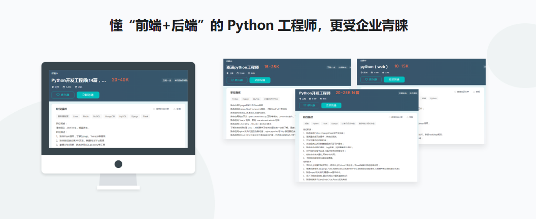 Python Web全栈工程师视频教程。本课完全对标大厂人才标准,2023 全新打造,全面讲解Python Web全栈工程师体系化知识,全新技术版本+企业级项目实战+全栈思维训练,一站式提升职场竞争力一门精深,多领域拓展,夯实迁移能力,挑战高薪岗位!