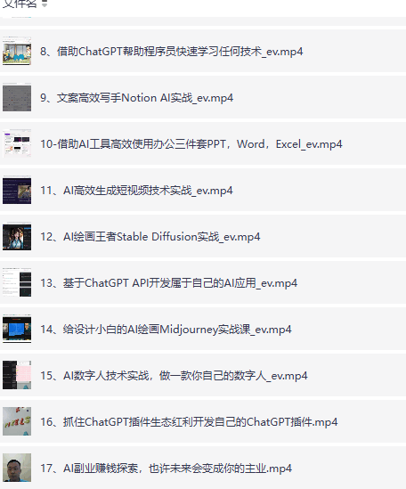 课程包含ChatGPT开发应用(秒杀系统、软件搭建、API开发)、AI编程助手(Cursor、Copilot、Bito)、AI办公(PPT/Word/Excel)、内容生成(短视频、文案写作)、AI绘画(Stable Diffusion、Midjourney)、数字人技术及插件开发,帮助学员快速掌握AI工具提升工作效率并探索副业机会。